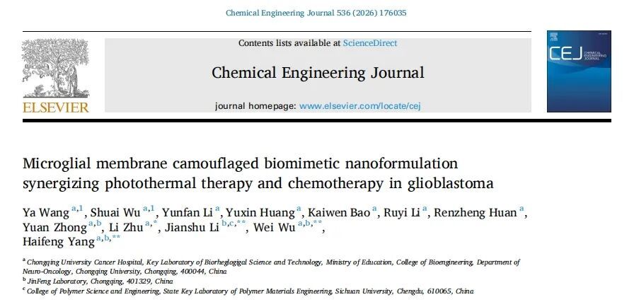 Wang Y, Wu S, Li Y, Huang Y, Bao K, Li R, Huan R, Zhong Y, Zhu L, Li J, Wu W, Yang H. Microglial membrane camouflaged biomimetic nanoformulation synergizing photothermal therapy and chemotherapy in glioblastoma[J]. Chemical Engineering Journal, 2026, 536: 176035