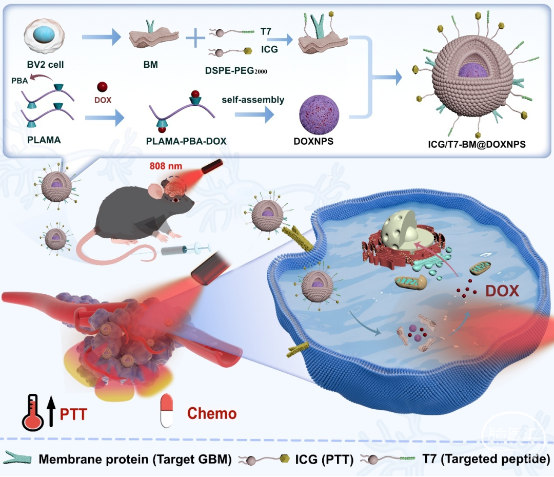 针对上述问题,研究团队提出了一种光热-化疗协同治疗策略,构建了小胶质细胞膜伪装的仿生纳米递药系统ICG/T7-BM@DOXNPS。该体系通过整合光热治疗与化疗,实现对胶质母细胞瘤的高效靶向治疗。