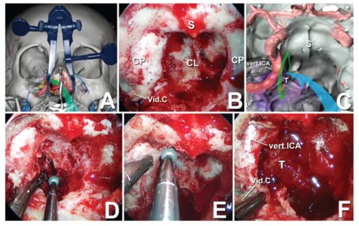 图1. A. 置入鼻窥器,绿色箭头显示ETAP的手术路径;B. 切开蝶窦前壁,显露鞍底(S)、斜坡隐窝(CL)、翼管(Vid. C)和颈动脉隆起(CP);C. 蓝色箭头显示蝶窦内的手术路径,绿色三角标记为颈内动脉后方的三角形间隙,紫色标记的为肿瘤组织(T);D和E. 于蝶窦下外侧角的后方开始磨除岩骨(D),然后沿着岩枕裂头尾方向扩大岩骨骨窗(E);F. 充分暴露颈内动脉垂直段(vert. ICA)和肿瘤。