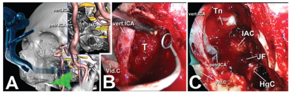 图2. A. 采用30度镜观察到颈动脉后窗内的解剖结构;蓝框内的图像进一步放大后显示,三叉神经(Tn)、内听道(IAC)、颈静脉孔(JF)和舌下神经管(HgC);B. 小心分离肿瘤与周围组织结构;C. 在肿瘤切除后,可见岩骨残留的空腔。