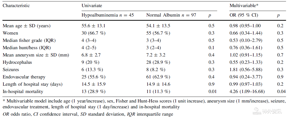 作者将2010年1月至2015年10月在德克萨斯州一家医学中心,以及2015年6月至2015年12月在阿根廷查米卡尔市一家医学中心就诊的aSAH患者进行筛选,记录年龄、性别、Hunt/Hess分级、Fisher分级、动脉直径、迟发性脑缺血的发生率等基本信息。患者按入院24小时内化验的血浆白蛋白水平分为低白蛋白组(<3.4g/dL)和正常白蛋白组,分析与首要结局-住院期间死亡率和次要结局-改良Rankin评分之间的关系。