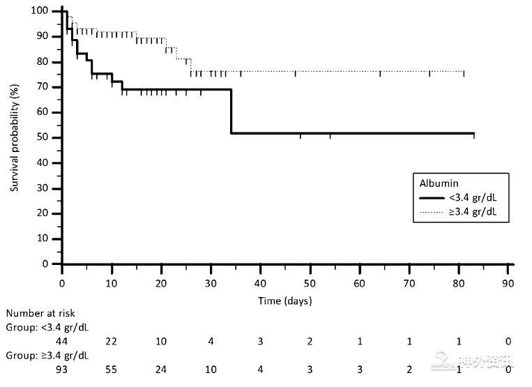 图1. 低白蛋白组和正常白蛋白组患者间的生存曲线对比。