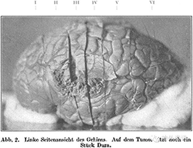 1927年Groeneveld和Schaltenbrand描述的病例是43岁男性患者,表现为右侧Jackson癫痫10年,伴持续性头痛3年;就诊前4月,患者出现进行性左侧痉挛性偏瘫,双侧视乳头水肿;在随后的12个月里,患者神经功能障碍继续加重。死亡前1月,出现右侧痉挛性偏瘫;尸检示左外侧裂附近有一个小苹果样大小的脑膜瘤,侵及Brodmann分区的1至4、6、9、22和40至43功能区(图1)。