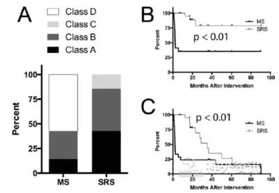 该医学中心的回顾性分析表明,对于肿瘤直径小于2.8cm的中小型VS,MS与SRS治疗后的并发症发生率均较低;未出现死亡病例;两种治疗手段均可获得良好的肿瘤控制率;SRS治疗患者的面听神经功能保留情况优于MS,并发症发生率更低。该研究SRS治疗后患者的随访时间较短,而且采取非随机对照分组,在设计上存在缺陷。在治疗方式的具体选择方面,应将期望的疗效和患者的意愿以及术者的经验,结合起来进行个体化的分析。