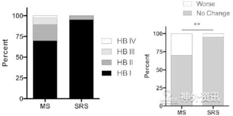图2. SRS组和MS组患者术后面神经功能的保留情况。左. 术后两组患者不同HB分级所占比例;右. 与术前HB分级比较,MS组术后面神经功能障碍的比例更高。