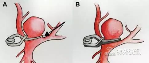 图28. 绿色箭头路径模拟,瘤颈部分遮挡,分离时容易在未临时阻断情况,先触碰动脉瘤破裂点。