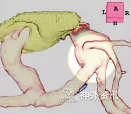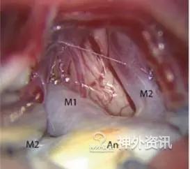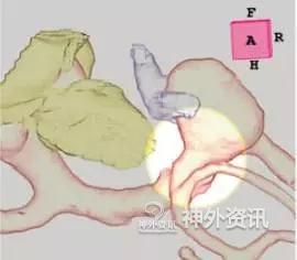 图19. 黄色箭头路径(更靠近后方),打开侧裂后的假想示意图,瘤颈载瘤动脉不受遮挡。