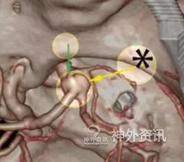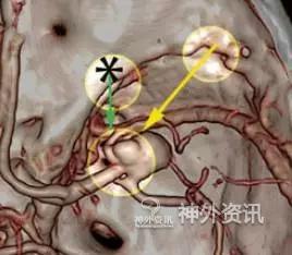 图18. 未破裂大脑中动脉瘤(绿色箭头路径侧裂开口更靠近前床突方向,黄色箭头路径侧裂开口更靠近后方)。