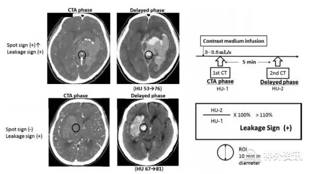 图1. 脑出血患者渗漏征的判断标准。在动脉相和延迟相上,标出血肿周围一宽为1cm的观察区(ROI)。分别测量动脉相和延迟相ROI区的HU值,HU增加>10%视为渗漏征阳性。
