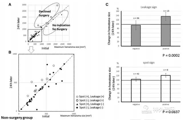 图2. 血肿变化与两种征象(斑点征和渗漏征)的关系。A. Dotblot分析,x轴代表入院时最大的血肿面积,y轴代表24小时后同一层面的血肿面积。B. A图中局部放大样本分析。C. 入院后24小时血肿面积的变化。上为渗漏征,下为斑点征。