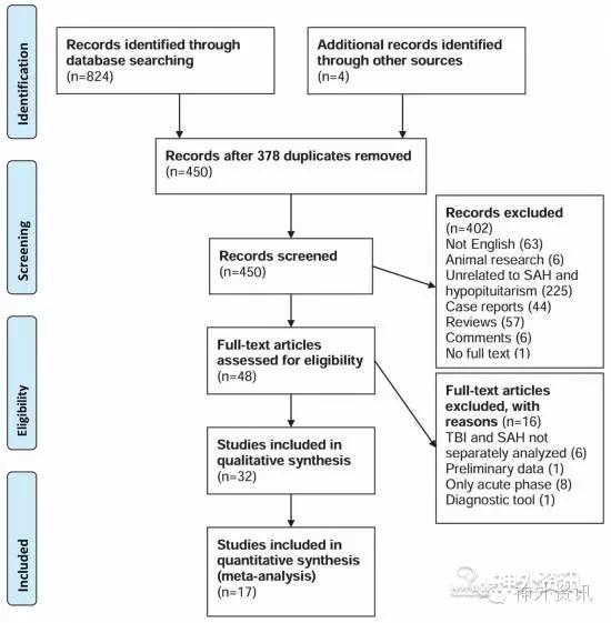 作者对2015年3月前的相关文献进行检索,最终纳入17篇用于定量分析(图1)。按照aSAH后发生垂体功能低下的时间分为3-6月组和>6月组,对生长激素缺乏(growth hormone deficiency,GHD)、尿崩以及肾上腺、性腺和甲状腺功能低下的发生率进行分析。