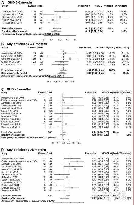 结果发现,17篇文献报道的aSAH后垂体功能低下的发生率差别很大,3-6月内的发生率为0.05-0.45,而>6月的发生率则在0-0.55;综合统计后发生率分别为0.31(95%CI,0.22-0.43)和0.25(95%CI,0.16-0.36)。上述垂体功能低下的发生率差别很大的原因,可能是各项研究采用的统计方法以及垂体相关激素检测方法不同所致。各垂体激素轴功能低下也有一定的发生比例(图2),其中生长激素缺乏症的发生率最高,3-6月的发生率为0.14 (95%CI,0.08-0.24),>6月的发生率为0.19(95%CI,0.13-0.26)(图3)。
