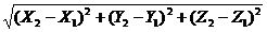 图2. 实际植入位点与计划植入位点之间偏差的计算示意图。实线1的顶端(X1,Y1,Z1)代表计划植入位点;虚线2的顶端(X2,Y2,Z2)代表实际植入位点。在三维空间中X轴代表内-外侧,Y轴代表前-后端,Z轴代表腹-背侧。两点间的几何学距离(ED)=