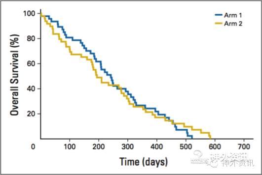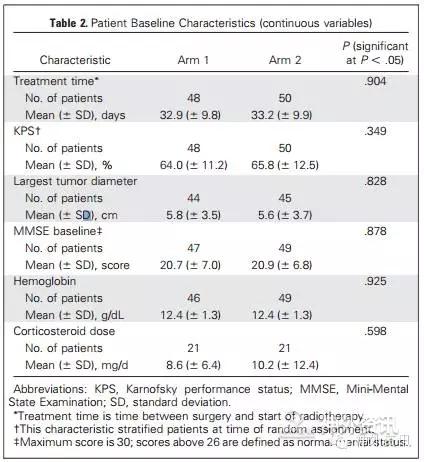 研究者在2010年至2013年的白俄罗斯、巴西和智利等12国家的医疗机构中选取98例老年或体弱的GBM患者,按1:1随机分成采用不同放疗方案的两组。两组患者在年龄、性别、放疗开始时间和肿瘤最大直径等方面均无显著性差异(表1)。
