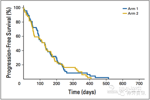 图2. 两组患者无进展生存期的Kaplan-Meier生存分析结果。