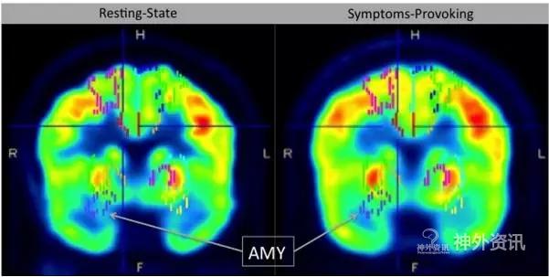 图1. 患者的任务激活态与静息态PET图像对比。任务激活态时双侧杏仁核、辅助运动皮质和中央旁区的代谢水平比静息态时明显增高。