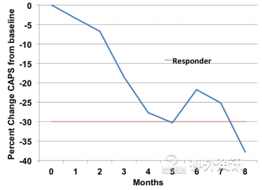 图2. 创伤后应激障碍诊断量表(CAPS)评分。红线是自定义的临床起效最低限度。在5个月时对刺激参数进行过调整,CAPS改善率随之下降,在6个月时调回到原来的刺激参数,CAPS改善率继续上升。