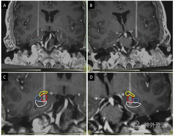 图3. 术后CT与术前MRI冠状面融合图像显示的电极轨道。A. 电极植入右侧BLn;B. 电极植入左侧BLn;C、D. 电极的4个触点分别位于不同的核团:黄色代表中央核(1个触点),红色代表BLn(2个触点),蓝色代表海马(1个触点)。