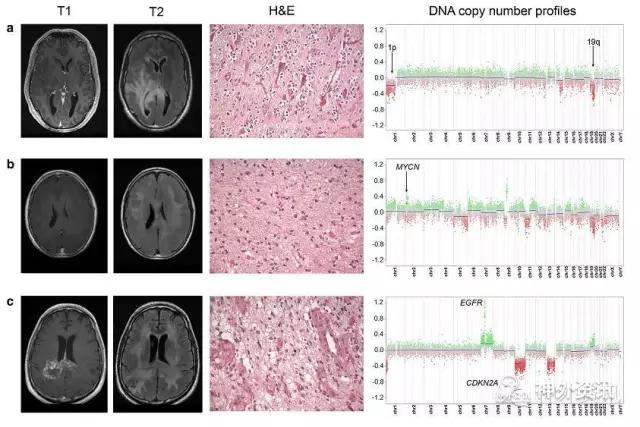 图1. 典型GC病例的神经影像学、病理学及遗传学改变。A. 病例1:GC具有1p/19q共缺失的少枝胶质细胞瘤表型;B. 病例2:GC具有IDH突变胶质瘤表型;C. 病例3:GC具有IDH野生型胶质母细胞瘤表型。