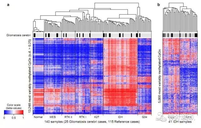 图2. 25例GC、10例正常脑组织和105例传统分类胶质瘤的甲基化表型分析。