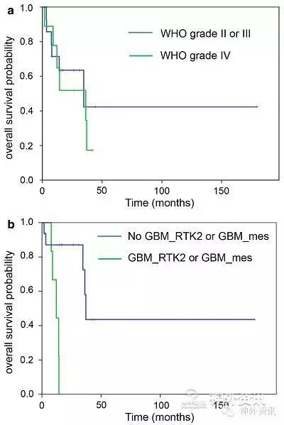 图3. GC患者的生存分析。A. WHO颅脑肿瘤病理学分级不能预测患者的预后;B. 分子学分型的RTK2表型和间质表型能预测患者的预后。