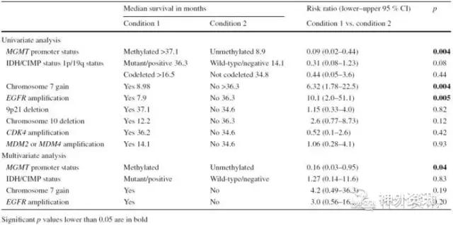 分析25例GC患者资料发现,WHO颅脑肿瘤病理学分级不是GC患者的预后影响因素。而在胶质瘤的分子学分型中,RTK2表型或间质表型的GC患者,总体预后相对较差(图3)。COX多元回归分析发现,MGMT启动子区甲基化是影响GC预后的正性因素(表1)。