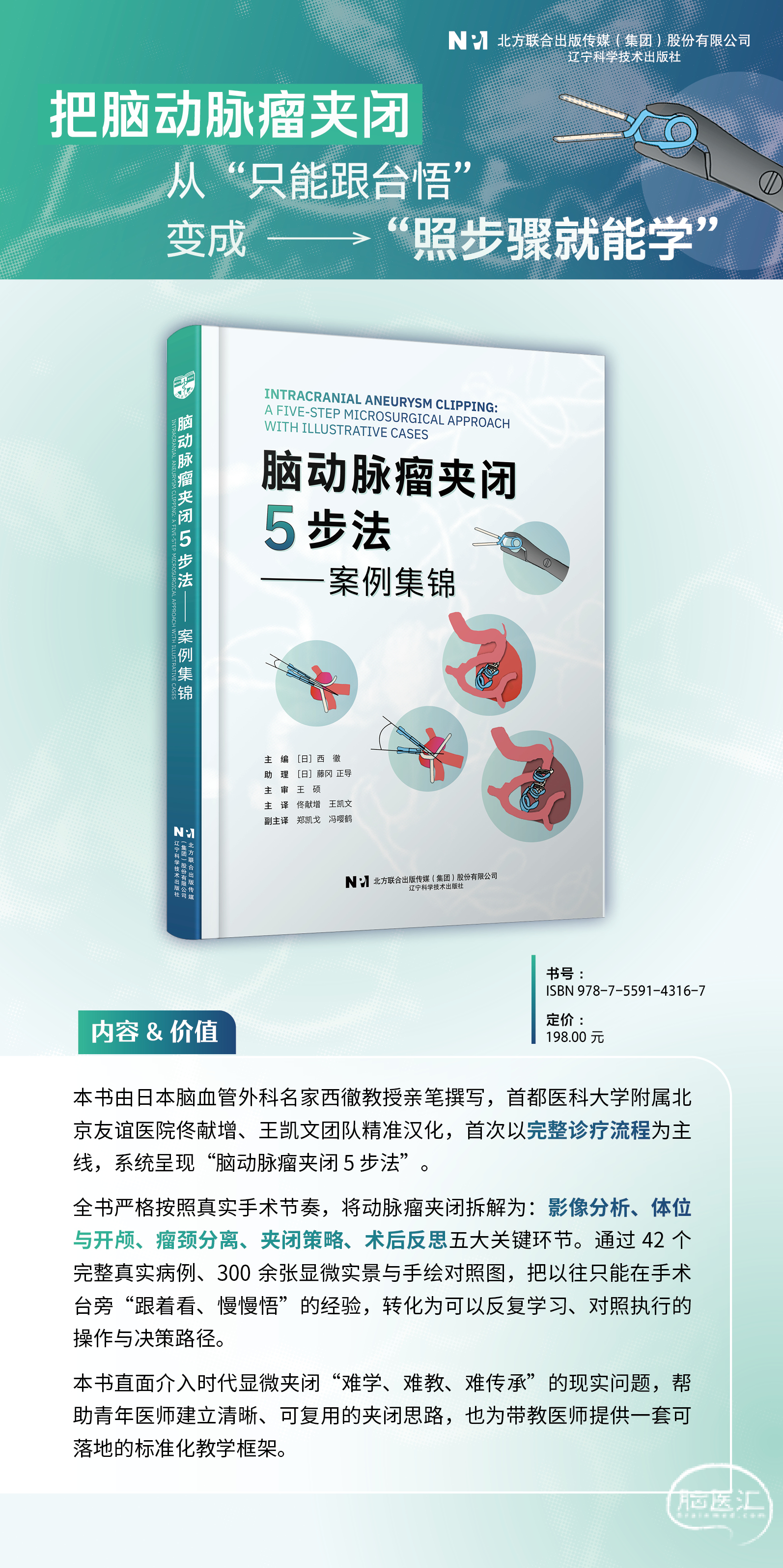 本书由日本脑血管外科名家西徹教授亲笔撰写,首都医科大学附属北京友谊医院佟献增、王凯文团队精准汉化,首次以完整诊疗流程为主线,系统呈现“脑动脉瘤夹闭 5 步法”。 全书严格按照真实手术节奏,将动脉瘤夹闭拆解为 影像分析、体位与开颅、瘤颈分离、夹闭策略、术后反思 五大关键环节。通过 42 个完整真实病例、300 余张显微实景与手绘对照图,把以往只能在手术台旁“跟着看、慢慢悟”的经验,转化为可以反复学习、对照执行的操作与决策路径。 本书直面介入时代显微夹闭“难学、难教、难传承”的现实问题,帮助青年医师建立清晰、可复用的夹闭思路,也为带教医师提供一套可落地的标准化教学框架。